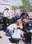 We emerge from the motel in the morning, ready for breakfast, when Pork Chop notices something amiss on the Barley so Pablo whips out the tool kit and does some repair work in the motel parking lot before we take off. We owners of fine Japanese engineering watch with mild fascination.