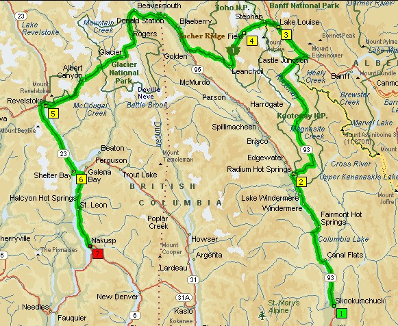 Once we cross, we head south to the Nakusp Hot Springs and set up camp. We learn how to flip Toonies to campground clerks and we spend a very enjoyable evening in camp.