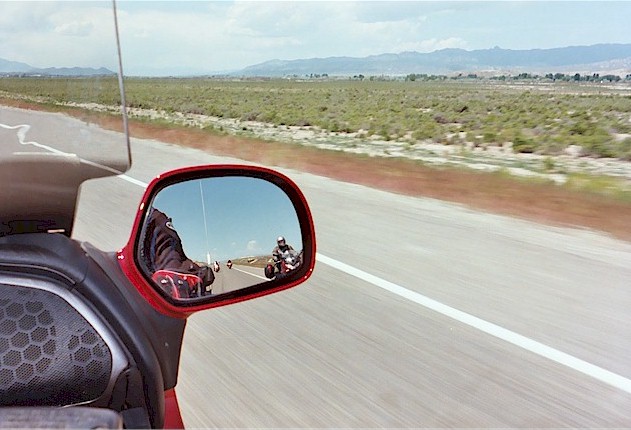 With this much superslab to cover, boredom is a real problem. One of us combats it by taking pictures of his mates in the mirror of his Gold Wing while listening to Steely Dan on the stereo. (Click on photo to view the entire photo)