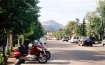 Lining the bikes up in downtown Breckenridge: That peak off in the distance is 14,000 feet high and there are no trees on it because it’s above the treeline. We saw people wearing t-shirts around town with “Got Air?” on them. Nice. And I don’t think they mean in your tires.