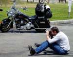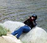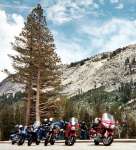 We head south on Hwy 395 and at the town of Lee Vining, we head west on Hwy 120 into Yosemite National Park. The high country is beautiful and we stop frequently to take photos of the scenery. Then at some point, we start taking photos of each other taking photos. Go figure. Just getting a good shot of the bikes can be tricky with all the auto, motorcycle and RV traffic and we end up crouching in ditches or lying on rocks along the lakeshore.