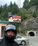 We pack the bikes, eat breakfast and come back out to the parking lot to find it raining. Off we go and we finally get to do some twisty, mountain riding as we head down the Frasier River valley. We stop in a lovely little BC town called Hope and Hell’s Gate is very scenic. We ride into another storm and the rainfall is so heavy that visibility is seriously impaired. We get stuck behind a couple of logging trucks and the spray from their rigs creates the equivalent of riding through a car wash. It takes some very intense riding to pass them. Of course, it never occurs to us to pull over and let it all pass. Nope. Gotta pass.