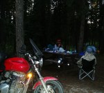 While we’re having a beer around the campfire, a helicopter comes in and lands on the roadside store’s lawn. I predict that it’s doing a booze and beer run and that’s confirmed by the store clerk. She says the pilot told her he was charging these guys, who were on a fishing expedition way out in the wilderness, by the minute for his services. We shake our heads in wonder, eat supper across the road at a funky, rundown restaurant and walk back to camp, admiring yet another glorious sunset. What a day of adventure touring it has been. Oh, and by the way, it rained on us today as well.