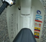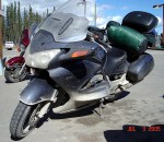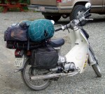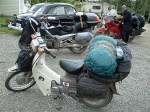 We stop for lunch at a place called Johnson’s Crossing, a little resort in the Yukon Territory, and we get a real surprise. A guy comes rolling in on a Honda Super Cub 50. His name is Nordy and he’s from Japan. We ask where he’s heading and he replies, “Prudhoe Bay”, which is on the Arctic Ocean at the end of the same treacherous 550 mile gravel road we road past yesterday. We ask where he started from and he replies, “The southern tip of South America, six months ago.” Ok, we’re not worthy! Here we are on these big, powerful sport touring machines, all impressed with what we’re doing, and he comes Nordy on his tiny two stroke. The fairing on his bike is covered with decals and well wishes made with a Sharpie that he’s collected along the way. Simply amazing!