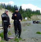We stumble into the restaurant at 7 AM and George and May are on duty. We’re in awe. George makes us ham and eggs just as he had promised to do the night before and May serves us. It takes a serious amount of coffee to get us jump started and May keeps it coming. We say our fond goodbyes and head out on the Alaska Highway. We travel through vast valley spaces of untouched forests interrupted only by the occasional abandoned cabin, boarded up gas station, and out-of-business restaurant. We wonder what people do to earn a living in this remote area but it’s actually no different from the many remote rural areas we’ve ridden through in the lower 48 during previous rides.