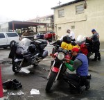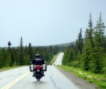 As we pass back through Anchorage, we stop at the Honda dealership and pick up a windshield for Trev. The naked bike windblast just gets too tiring after a few days. We did this before on another trip in Montana and that windshield must be gathering dust back home. Oh well. We also stop at Denali Harley in Wasilla so our two Harley riders can buy t-shirts. We head up the Parks Highway and stop at what is deemed the best vantage point for viewing Denali but as the sign says, the mountain makes it own weather and is rarely visible. Further up the road, we encounter some of that weather but as we ride into the rain shadow caused by Denali, the rain stops and the road dries up.