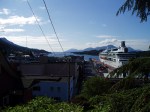 We get four hours off in Ketchikan and after a monster breakfast, worthy of a very hungry lumberjack, we stroll around. Since the gigantic cruise ships dock here, usually 4 to 5 ships per day resulting in 12,000 tourists being turned loose on this tiny town of 8,000 residents, the majority of stores are jewelry and fur shops. The locals complain about this at the slightest mention of it and talk of how this American town is now mainly owned by foreign companies.