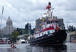 Meanwhile, we walk down to the end of our dock where we have an unobstructed view of the Olympia harbor because we’ve heard there are going to be tugboat races. Sure enough, there are a bunch of them docked at Percival Landing and here they come, one by one, as they head North up Budd Inlet out past the no wake zone. Inga, Freya and I sit down and watch this delightful parade float past our vantage point. As we marvel at the beauty and style of each of these hard working boats, I remark that even though we’ve lived here since 1987, the full extent of the Puget Sound maritime culture never really occurred to me until now. Inga shoots me one of those “No shit, Sherlock!” looks. Nevertheless, take a look at my slideshow below. — Scott Bruce Duncan */:-)