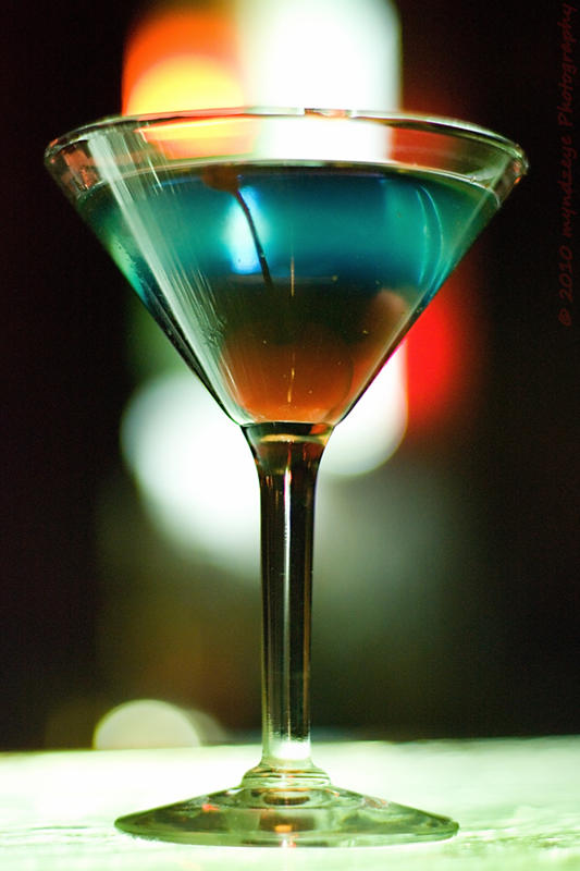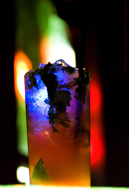 We inhabit the section of bar in front of the handsome wall cabinet humidors and arrange for drinks while lighting up. The first few hits on my Magnum take me off guard as I taste ground-up, dried leaves raked up off some dude’s lawn with some peat moss mixed in for flavor — wow — how delightfully organic! Yak! But then the cigar settles down and delivers the robust taste of premium tobacco leaf — it’s going to be a fine smoke. Scott gets right to work on his photography project atop the sculpted-to-look-like-ice glass bar top. While I settle into a delicious Robert Mondavi Cabernet, Scott proceeds to order colorful drinks that look rather revolting, especially the Gummy Bear Martini, which he gingerly samples and declares to be disgustingly sweet — no shit, Sherlock! Undeterred, he steadfastly arranges drinks and shoots them from various angles that the rest of us find to be rather entertaining while we puff and sip away. After awhile, though, this event becomes more akin to a movie set with Scott as the director than a simple photo shoot. All three bartenders are now bringing him colorful, no-cost, non-alcoholic contributions to the project and he’s got the rest of us acting as support staff and cocktail models. No worries — I order another glass of wine for fortitude.