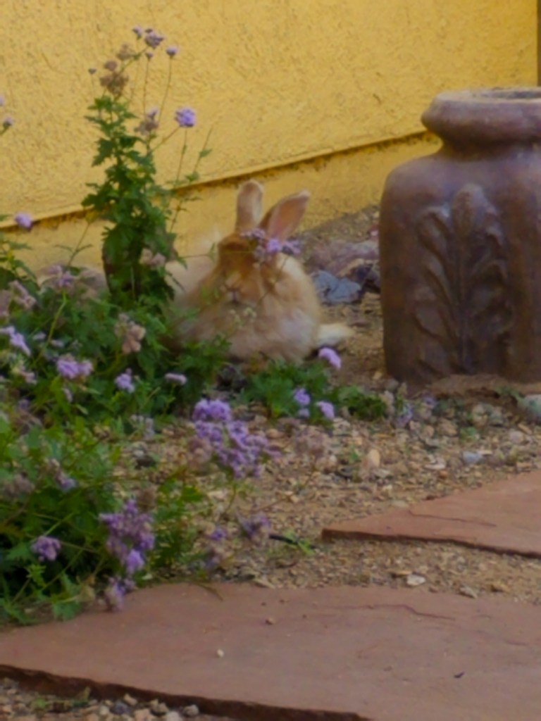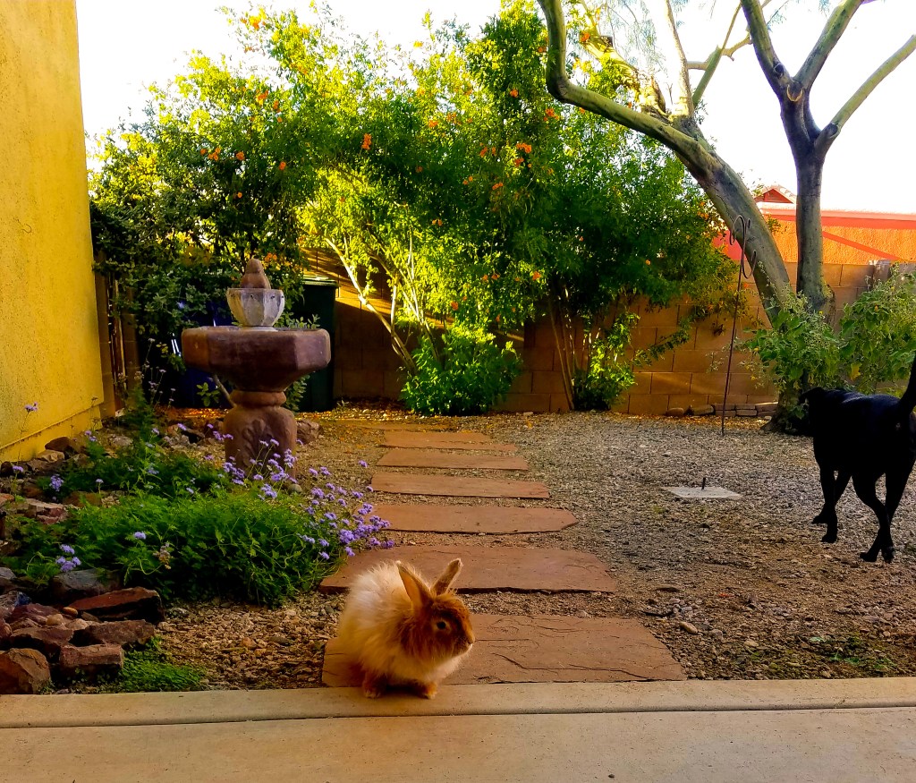 The years go by and I spend less and less time with Winston in the side yard as my job demands more of my time and energy, my chronic pain increases, and I take refuge in the Smokehouse Man Cave garden shed I have installed in the backyard due to the wet, chilly Seattle weather which means he spends more and more time in his big crate in the laundry room. It bothers me and do I get him out now and then, but it’s not enough to assuage my guilt. I finally get a chance to remedy this when we put the house in Seattle on the market and we buy a house in Tucson, Arizona. I head down in early November to occupy the new place and I bring Gracie, Winston, and Maggie, our cat, with me while Inga and Robbie stay behind to sell the house. Working from home and having a perfect, enclosed back yard and a delightfully conducive climate for toiling out on the back patio, I let Winston out each morning as I begin work to spend the entire day. With canine consistency, Gracie noses him him over every day, first thing, and then cheerfully hangs out with us. Winston and I both respond with “whatever” eye rolls. He is now quite ancient in bunny years. He recovers from being cooped up in a crate and savors being free. He hops here and there, nibbles on this and that, and exudes contentment. The hole in my heart is healed and I treasure being able to share this with him while my scarred up spine soaks up the therapeutic dry heat. Cigars are smoked, money is earned, and every day Winston gets out here is a gift.