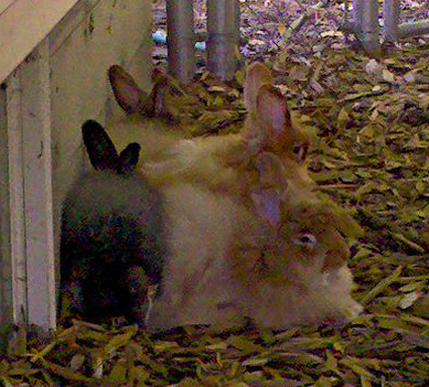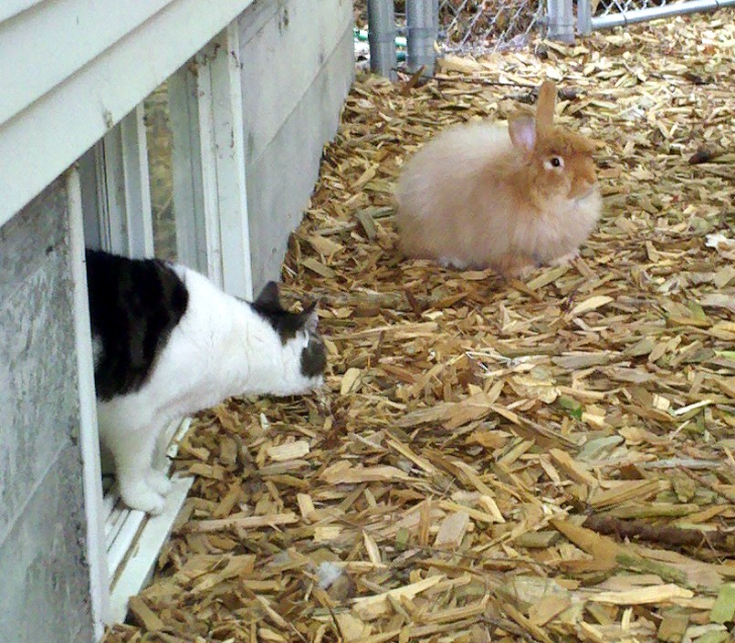 I was always careful to keep Winston separated from the dogs, especially Gracie, our feral Formosan Mountain Dog, a type of hunting dog used in packs to bring down wild boar, who was rescued as a puppy out of a talus slope on the beach in Taiwan. I figured Robbie, our 75 lb. certified therapy sled dog, would be okay with Winston but I didn’t want to risk it with Gracie in case her hunting instincts kicked in. After all, the occasional rat who got caught sneaking in the dog yard at night to snack on dog poop would be found the next morning with a cleanly broken neck. Well, despite my best efforts, both Gracie and Robbie get past me one afternoon and run right for Winston. Predictably, Robbie is scampering up to him with his “Hey little buddy, let’s play!” body language but Gracie charges him like a guided missile. I stand on the porch thundering profanities about how I am going to break her neck if she hurts him but to no avail. She races up, stops on a dime, gently pushes him over with her nose, and stands over him smiling a toothy coyote grin. Tag, you’re it and he’s lying on his side with an expression of “Really? Is this necessary?”. Gracie: “Yup, it is. Low man on totem pole. Just making sure you know it, rabbit.” Okay, I can breathe again. My beloved rabbit is unharmed and I don’t have to wring my daughter’s neck. Whew! Going forward, the four of us do yard time in complete harmony.
