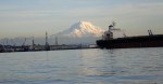 25-Nov-2005: We’ve been exploring our new neighborhood, a section of Puget Sound called the East Passage. It links Seattle to Tacoma and is used by huge commercial and much smaller recreational vessels alike. It’s even divided up into northbound and southbound lanes for the tugs and container ships. The pleasure craft can use whatever is left which is more than enough. Compared to the narrow inlets and islands around Olympia where we first moored the boat, it’s huge. Our marina in Des Moines is located at the narrowest section of the East Passage. It’s a mile and a half across to the Point Robinson lighthouse. A mere loop trip around the East Passage, either North or South, results in a 20 mile ride. We’ve gone South to check out Commencement Bay, the industrial harbor at Tacoma. On another day, we went West over to Vashon Island and explored Quartermaster Harbor. Today, we’ve gone North to Elliott Bay, Seattle’s big harbor. Careful to stay out of the giant ferry boat lanes, we motor along Alki Beach that we’ve walked countless times since we moved to Seattle in 1987. We spot a harbor seal and give a couple of fishermen wide berth. A Seattle Police boat joins us along the shore and we follow it around Duwamish Head. Now we are directly opposite the Seattle skyline and next to Harbor Island where all the container ships unload. As this is a busy working port, we keep a