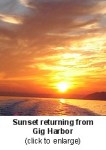 We hop in the boat, fire up the diesel and cast off. As we slowly head out of the harbor in the narrow navigation channel, we spot three otters swimming into the harbor. Once clear, we circumnavigate the island. On the North end of the island, massive Washington State ferries are running through Rich Passage on their way between Seattle and Bremerton. We’re tempted to follow them into Bremerton to catch a glimpse of the Navy yard but again, as the sun is heading for the horizon, we resolve to save such exploring for another adventure. On the South end of Blake Island, we slow down to let a tug towing a barge pass by that is coming North out of the Colvos Passage and heading for Elliott Bay. Then we dodge the two ferries that are running between Fauntleroy on the mainland, Vashon Island, and Southworth on the Kitsap Peninsula before heading for home, feeling very satisfied with our Winter excursion.